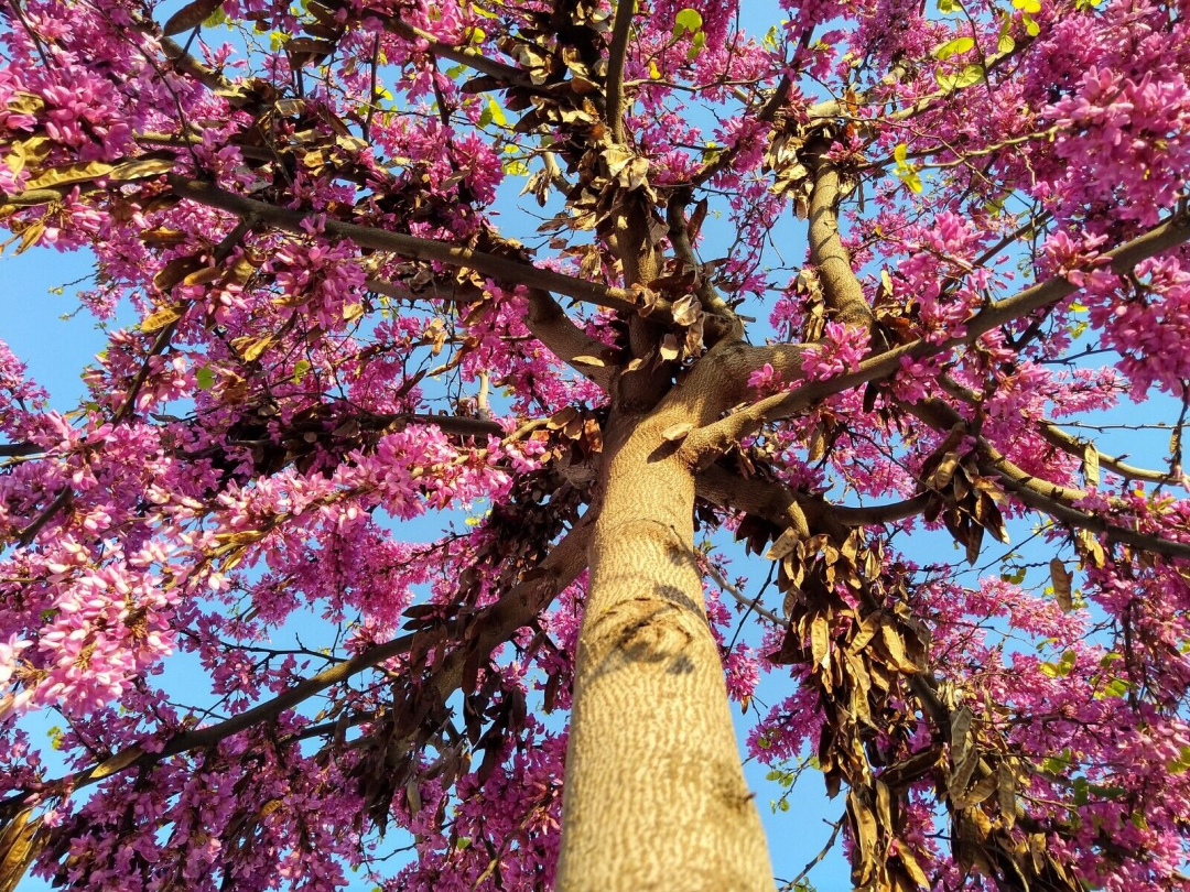 紫荊屬是豆科云實亞科下的一個屬,原產于溫帶或暖溫帶地區(qū),多為小型落葉喬木或大灌木,也有大喬木。如在安徽天堂寨、陜西太平山兩個森林公園中自然分布的湖北紫荊大樹,胸徑達40多厘米,樹高25—30米。